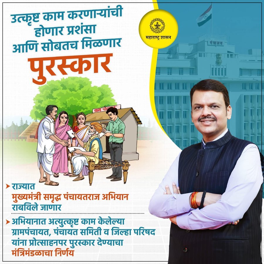 राज्य शासनाच्या ग्रामविकास विभागाने “मुख्यमंत्री समृद्ध पंचायतराज अभियान” या महत्वाकांक्षी अभियानाच्या अंमलबजावणीचा निर्णय घेतला आहे. यामध्ये जिल्हा परिषद, पंचायत समिती आणि ग्रामपंचायतींना त्यांच्या कामगिरीनुसार प्रोत्साहित करून त्यांची कार्यक्षमता वाढविणे, त्यांना स्पर्धात्मक वातावरणातून नवीन उर्जा देणे, शासकीय योजनांची प्रभावी अंमलबजावणी करणे, योजनांचा लाभ ग्रामीण भागातील शेवटच्या घटकापर्यंत पोहोचविणे व त्यातून ग्रामीण भागातील लोकांचे जीवनमान उंचावणे या उद्देशाने ही योजना तयार करण्यात आली आहे. ग्रामपंचायतींमध्ये लोकसहभागाची चळवळ निर्माण करणे, ग्रामीण नागरिकांना सुलभ रीतीने सेवा देणे, आरोग्य, शिक्षण, उपजीविका, सामाजिक न्याय या क्षेत्रांमध्ये ग्रामपंचायतींचा सहभाग वाढविणे, यासाठी सन २०२५-२६ या आर्थिक वर्षापासून “मुख्यमंत्री समृद्ध पंचायतराज अभियान” राबविण्यात येणार आहे.